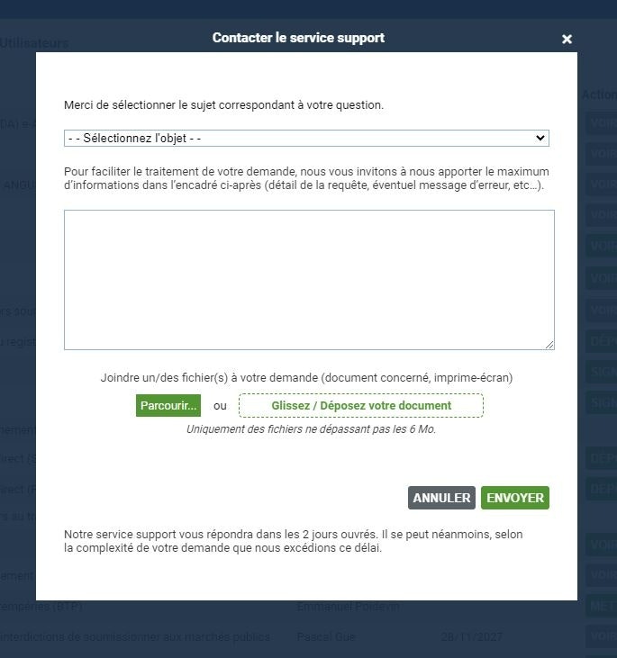 A window allowing you to enter your message will open, please select the subject, complete your request and possibly attach an attachment.